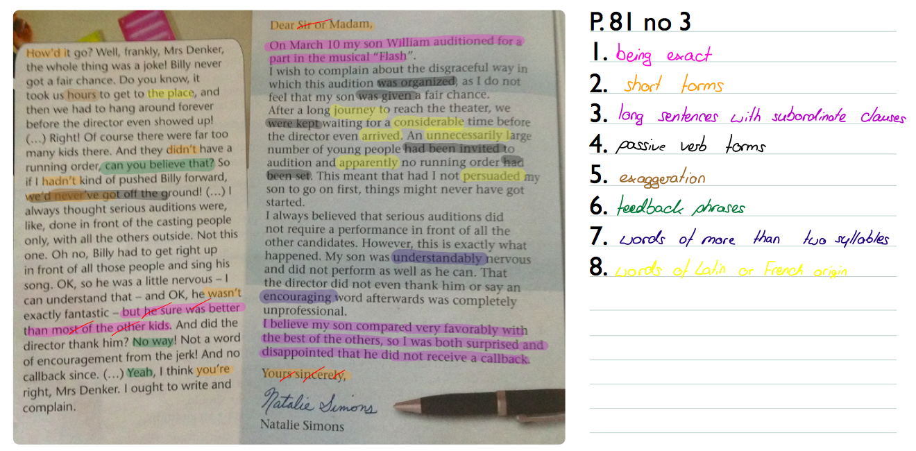 In unserer iPad-Klasse liegt es nahe, einen Text einfach abzufotografieren und ins Notizbuch zu kopieren– schon kann nach Belieben damit gearbeitet werden. Sowohl Schreibstift wie auch Textmarker stehen in 15 Farben (plus weiß) sowie in fast beliebiger Strichstärke zur Verfügung. Hier ein Beispiel eines (verbesserten) Hefteintrags eines Schülers:
