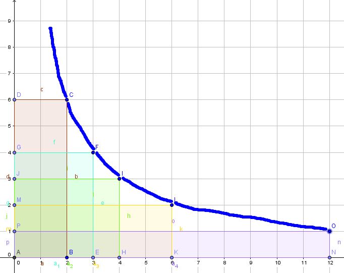 GeoGebra bietet sogar die Möglichkeit die Spur eines Punktes anzuzeigen, wenn man diesen verschiebt. Damit war es nun auch möglich die zugehörige Kurve zur indirekten Proportionalität zu ermitteln. Es entsteht ein Hyperbelast.
