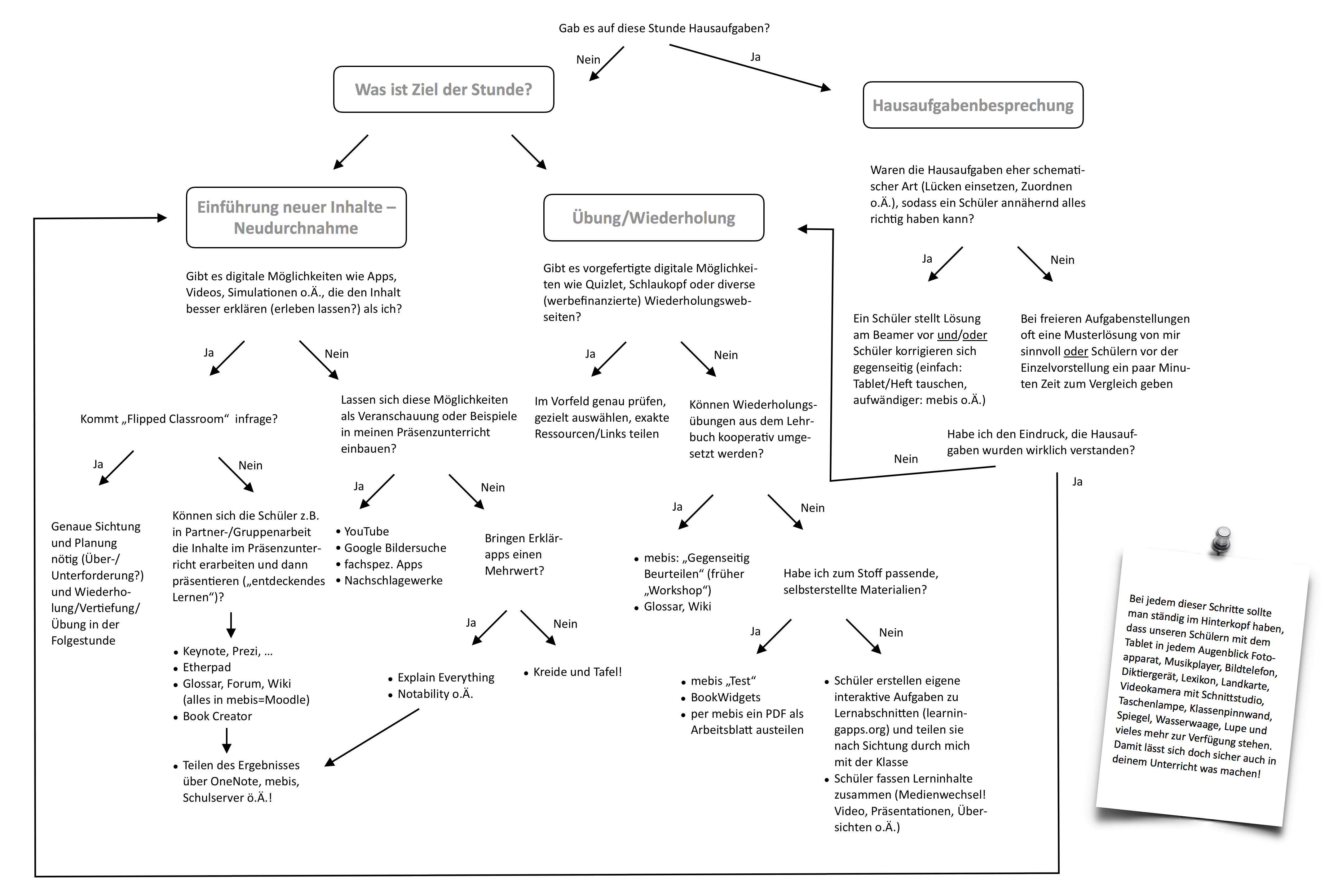 Schon länger wollte ich mal eine Art Überblick zusammenstellen, was den Unterricht in unseren Tabletklassen ausmacht. Ohne mich dabei in Details zu verlieren und auf alle Fächer einigermaßen übertragbar. Gerade letzteres ist angesichts der völlig unterschiedlichen fachdidaktischen Notwendigkeiten am Gymnasium natürlich die größte Schwierigkeit. Deshalb ist dieses Blatt wahrscheinlich nicht mehr als ein Grundgerüst, an dem sich unsere „neuen“ Kollegen in den Tabletklassen vielleicht mal entlanghangeln und sich eine erste Übersicht verschaffen können – sicherlich besser als nichts … Wie immer wäre ich um weitere Gesichtspunkte in den Kommentaren wie immer sehr dankbar.