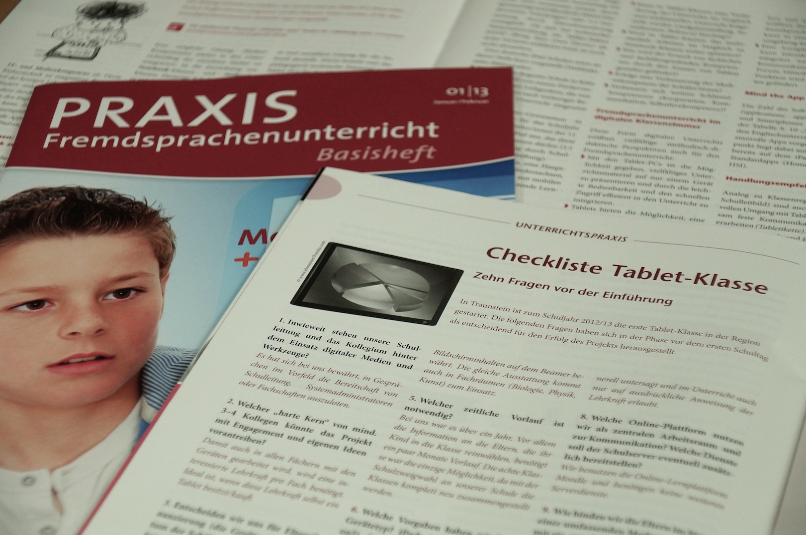 Unser Projekt findet langsam Eingang in Fachpublikationen. In der aktuellen „Praxis Fremdsprachenunterricht“ geht es gleich in zwei Artikeln um unsere iPad-Klasse. Das Heft bietet auch darüber hinaus eine Fülle an Gedanken und Anregungen zum Thema Mobile Learning und sei hiermit allen Interessierten für die immer noch ziemlich langen, dunklen Winterabende wärmstens ans Herz gelegt.